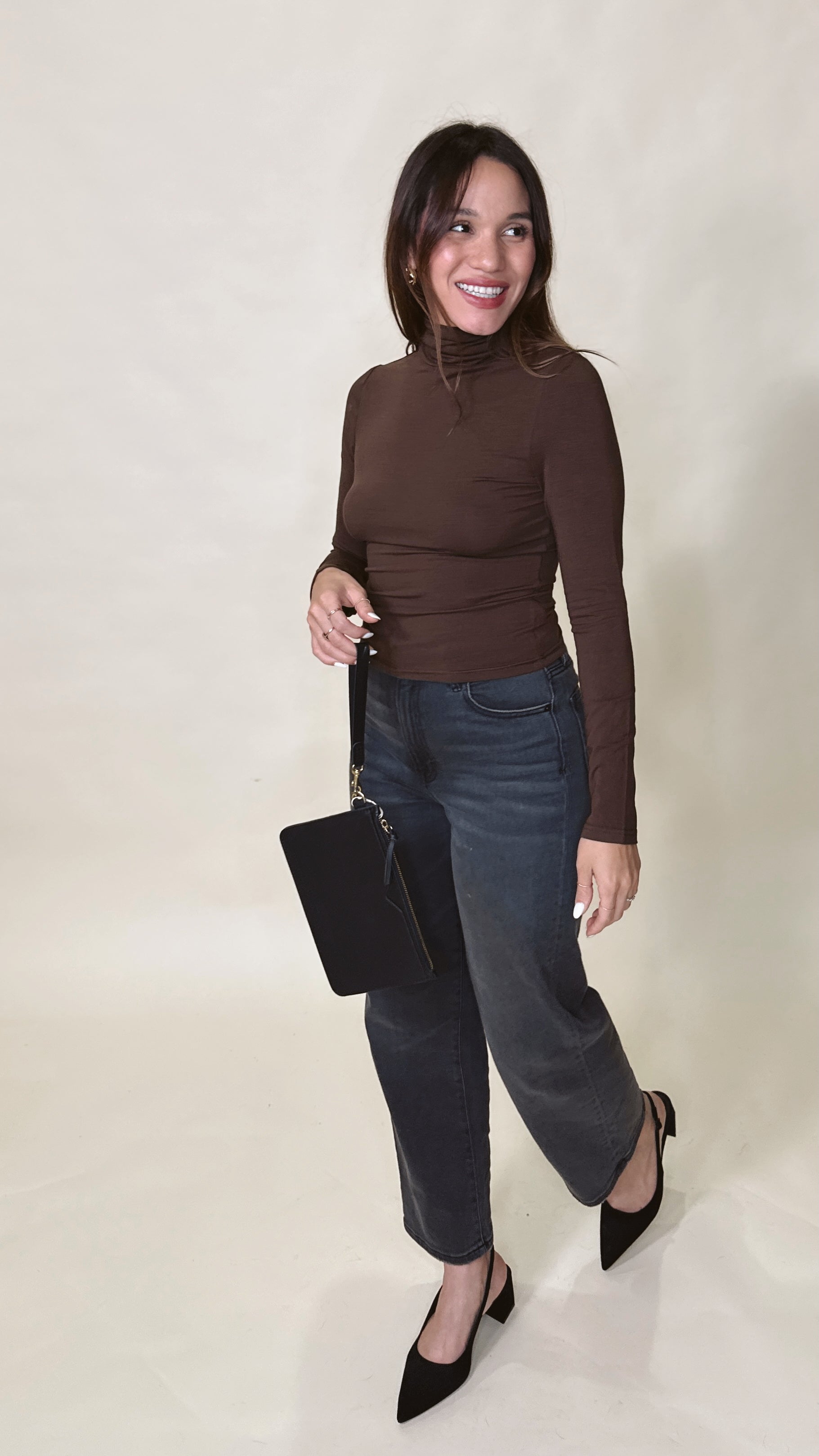 The Chocolate Turtleneck Top features a smooth, fitted silhouette with long sleeves and a clean, classic neckline. Soft, simple, and an easy essential for cooler days.